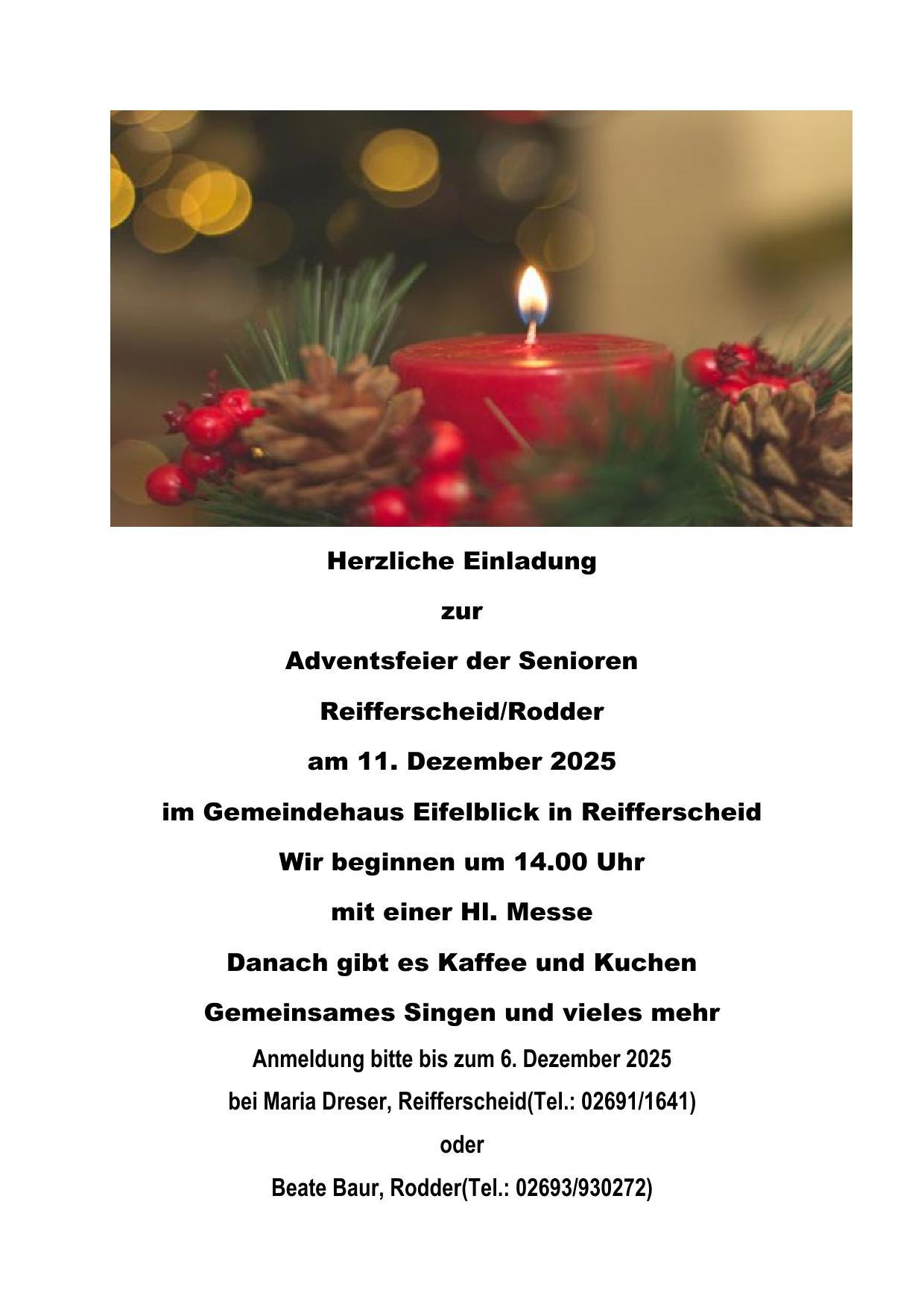 17.11.2025Gemeinde Adventsfeier der Senioren17.11.2025Adventsfeier der Senioren der Pfarrei Reifferscheid/Rodder.Mehr lesen