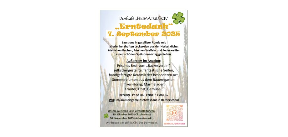 am 7. September 2025 von 12.30 Uhr bis 17.00 Uhr findet in Reifferscheid am/im Gemeindehaus "Eifelblick" die nächste Dorfcafè-Veranstaltung (Erntedank 2025) statt.