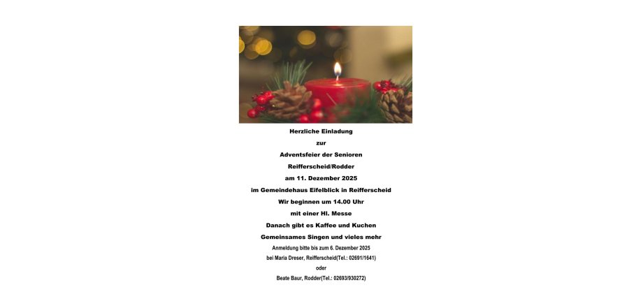 am 11. Dezember 2025 um 14.00 Uhr findet in Reifferscheid am Gemeindehaus "Eifelblick" die Adventsfeier der Senioren statt.