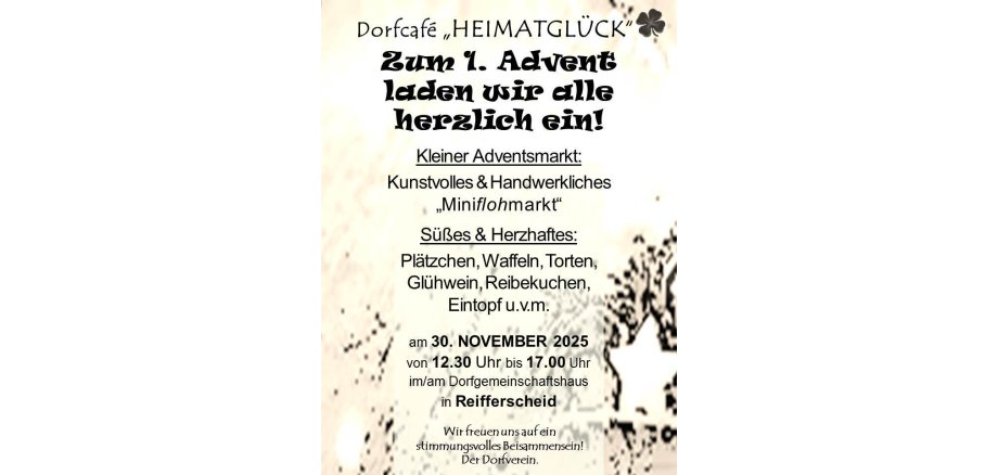 am 30. November 2025, von 12.30 bis 17.00 Uhr lädt der Dorfverein Reifferscheid herzlich zum 1. Advent ein.
